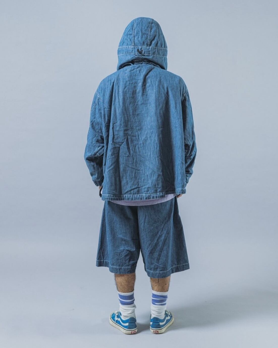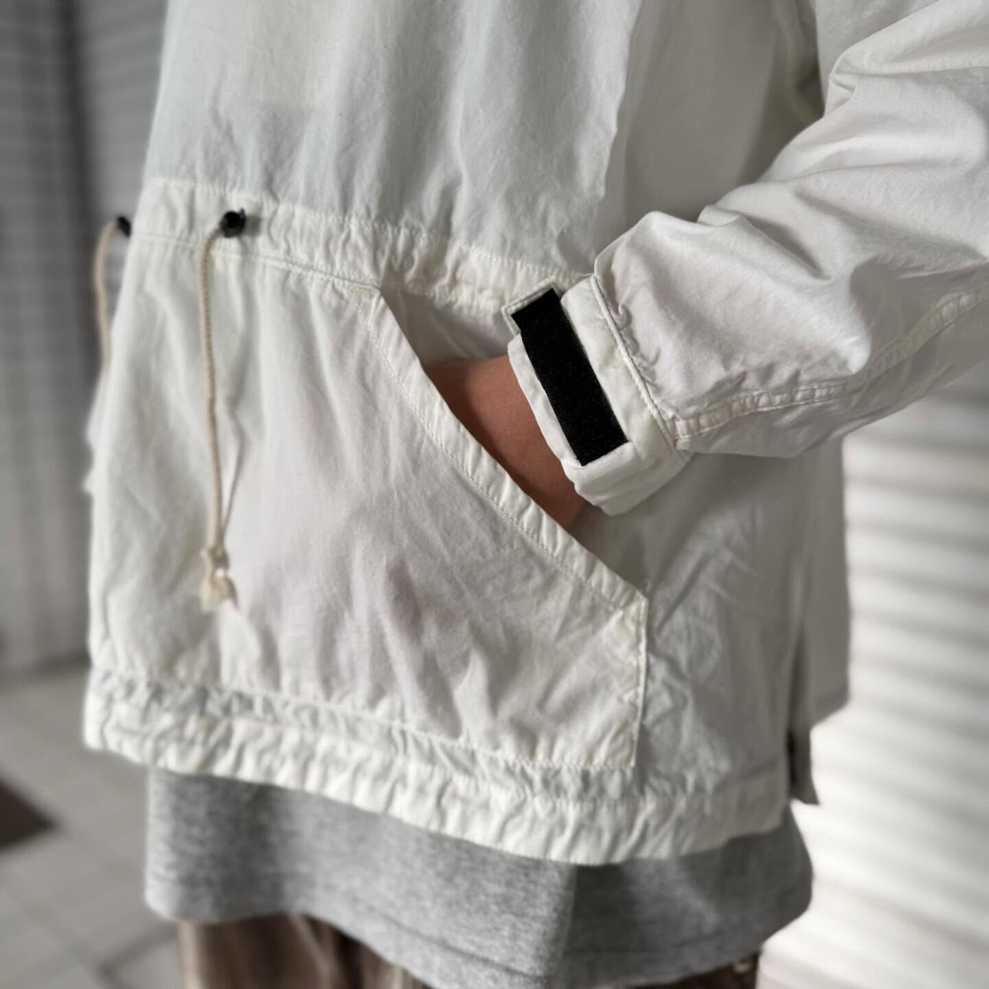 裾の前後にもドローコードを忍ばせており、絞り方によってシルエットや着丈のバランスを自在に調整できます。素材には5ozのポプリン生地を使用。