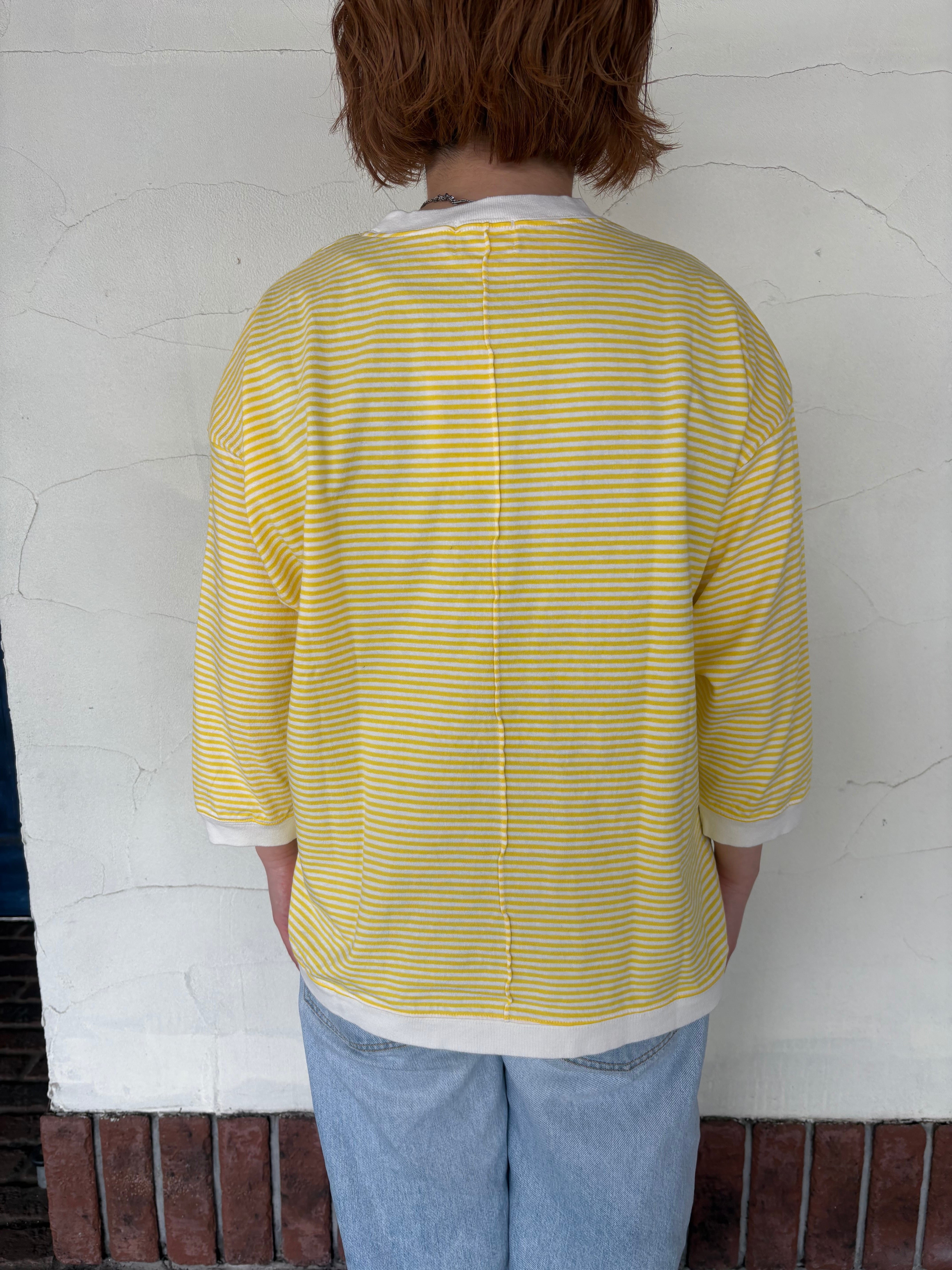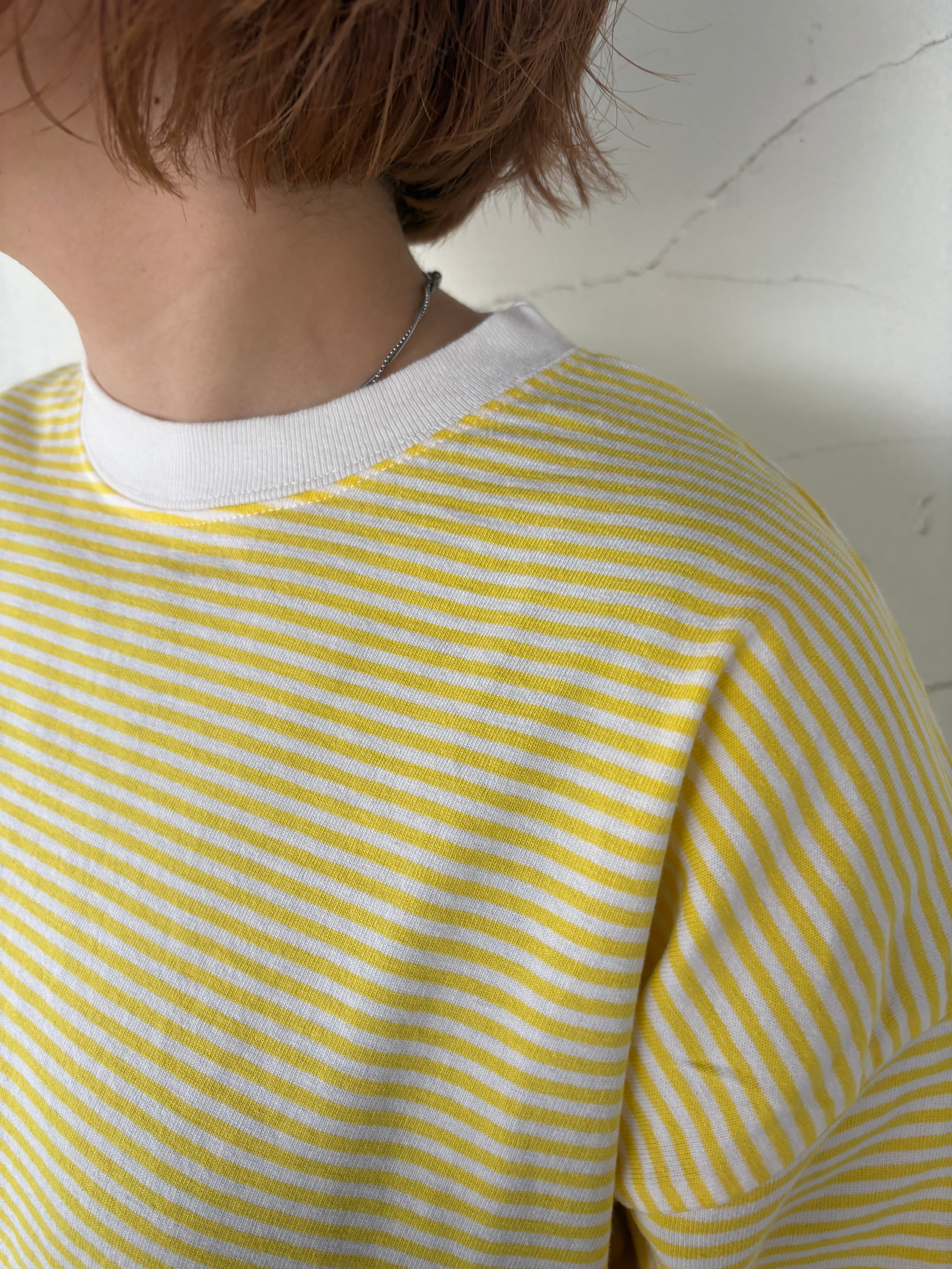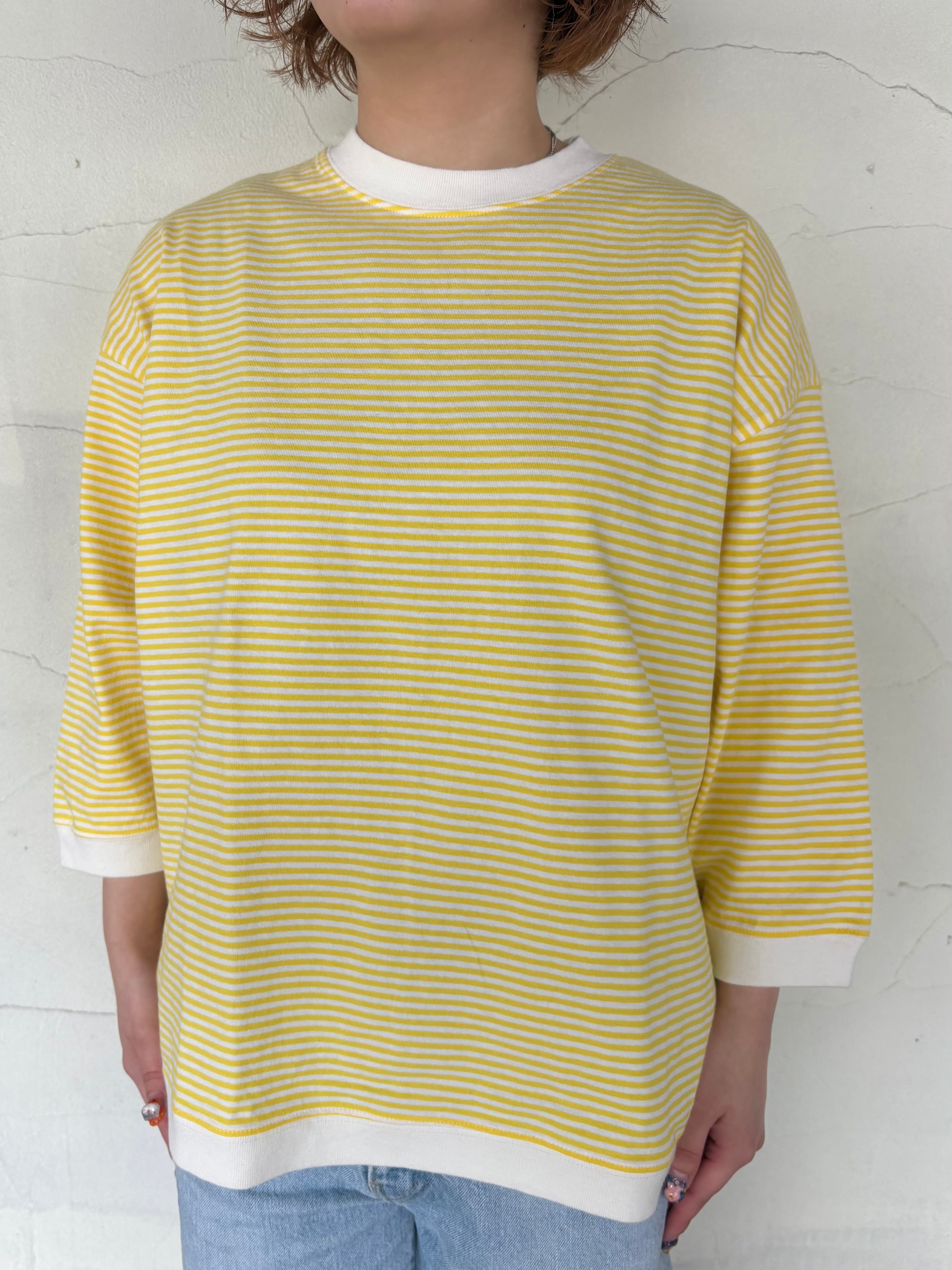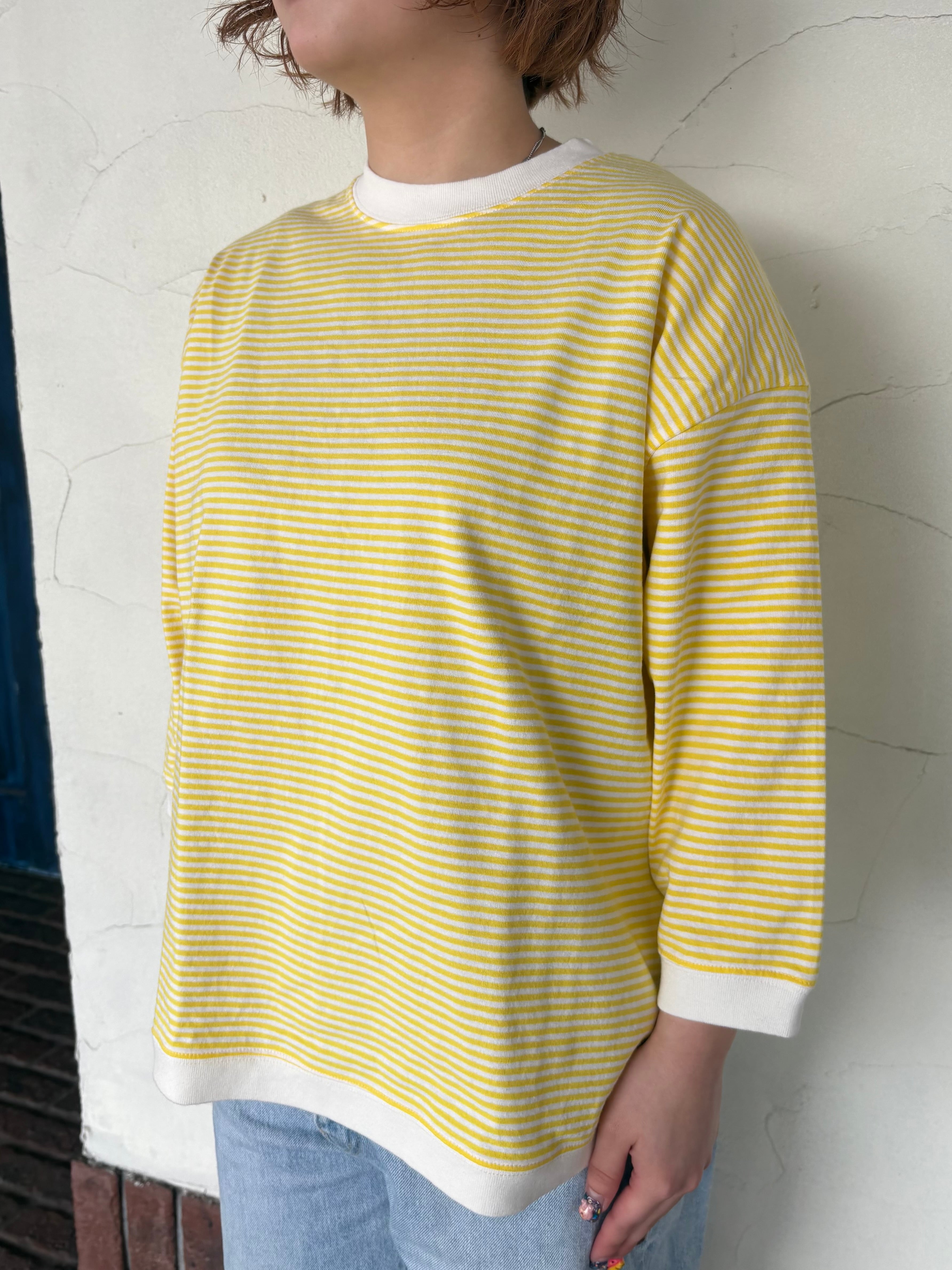 やさしいイエローの細ボーダーが、コーディネートを明るく見せてくれる七分袖Tシャツでございます。さらりとしたコットン100%の生地で、暑い時期にも心地よくお召しいただけます。