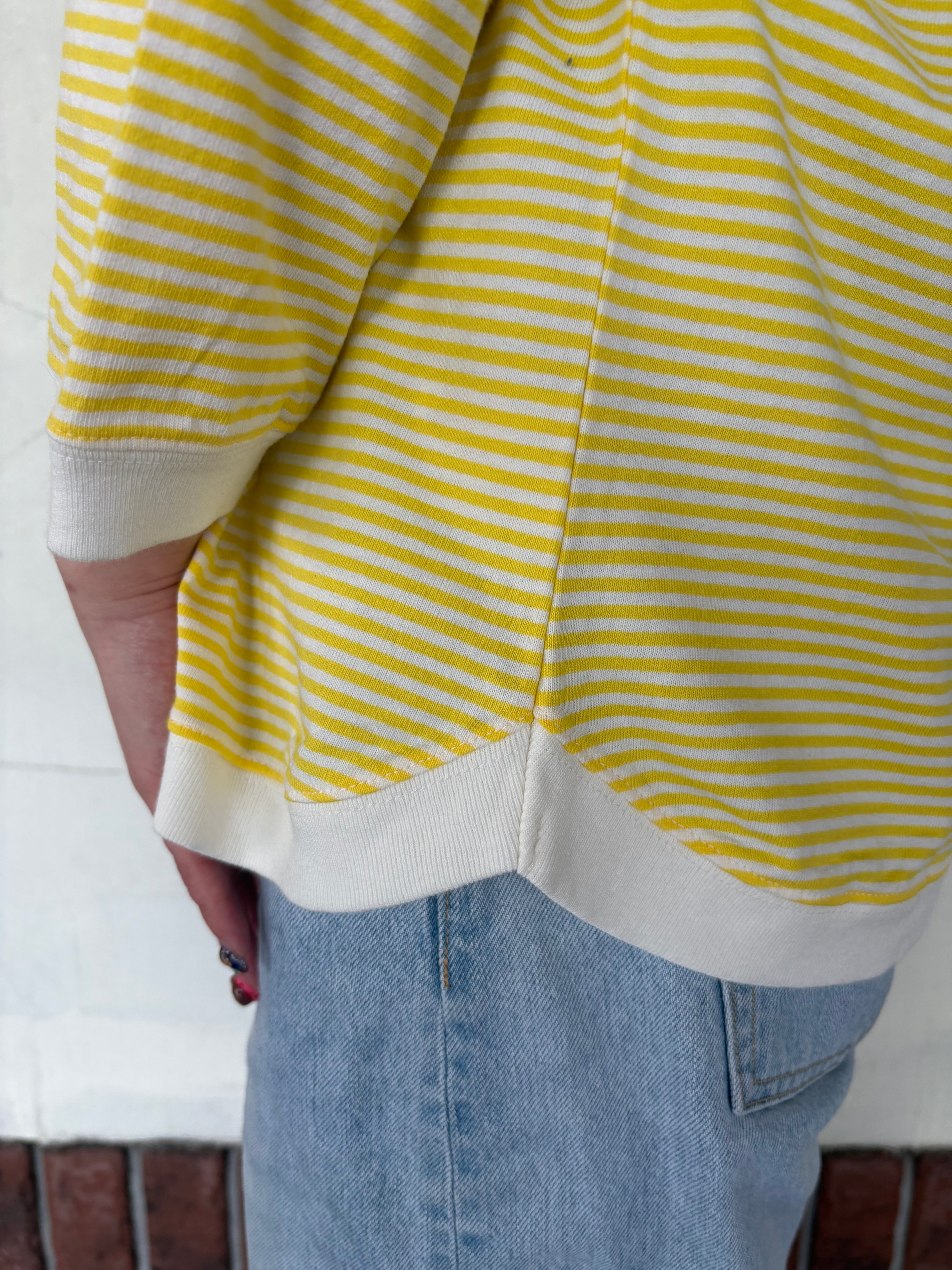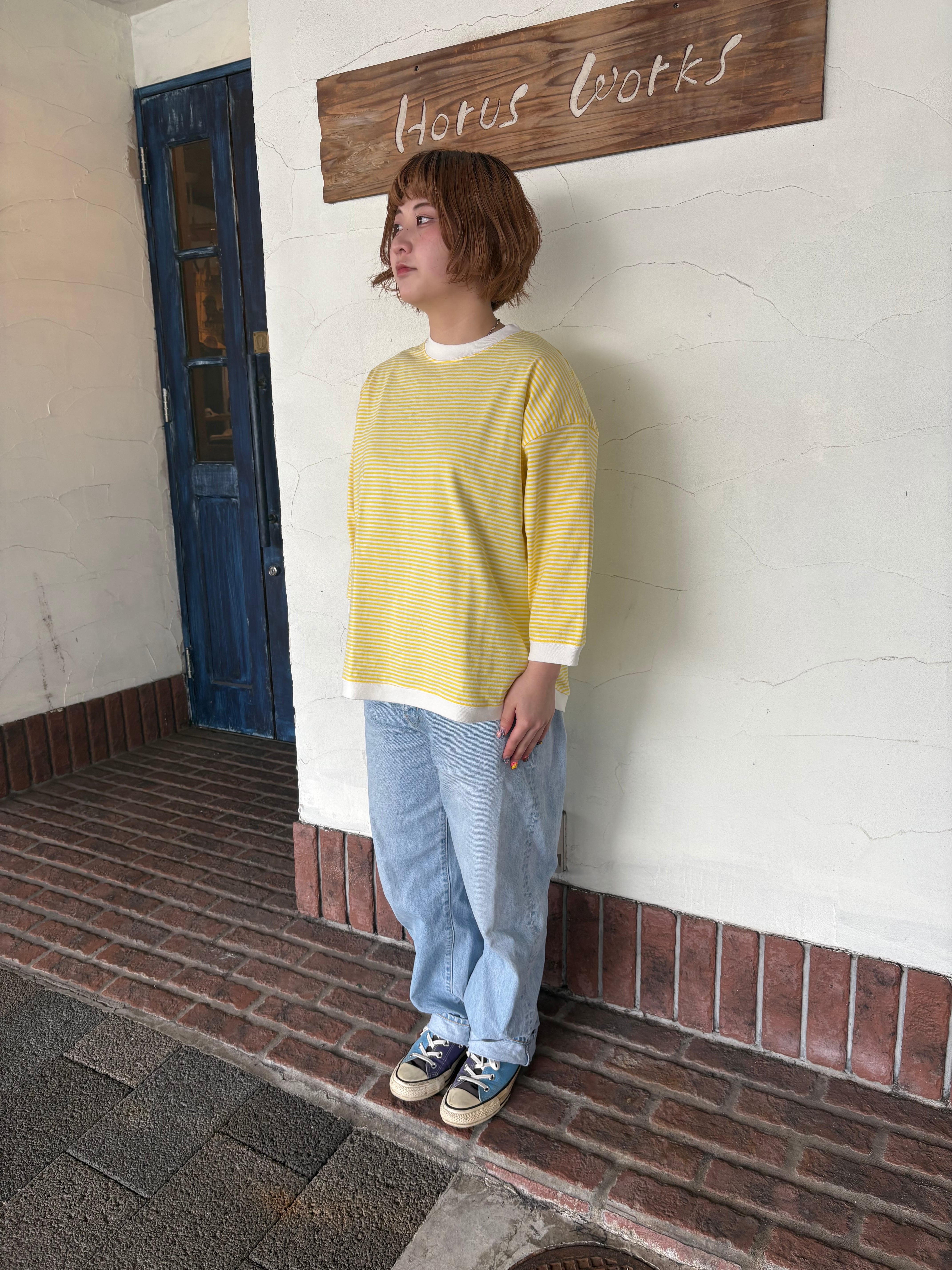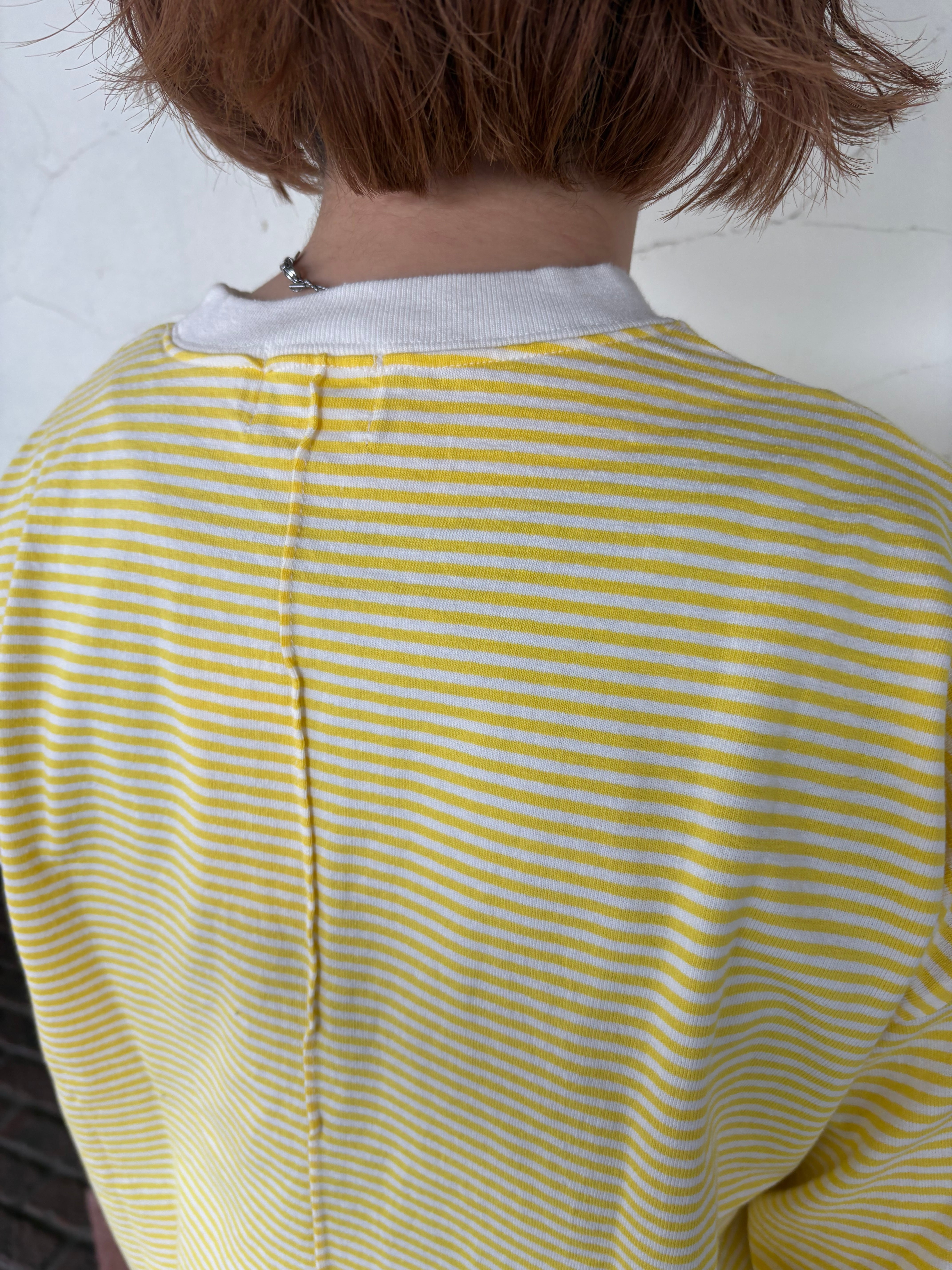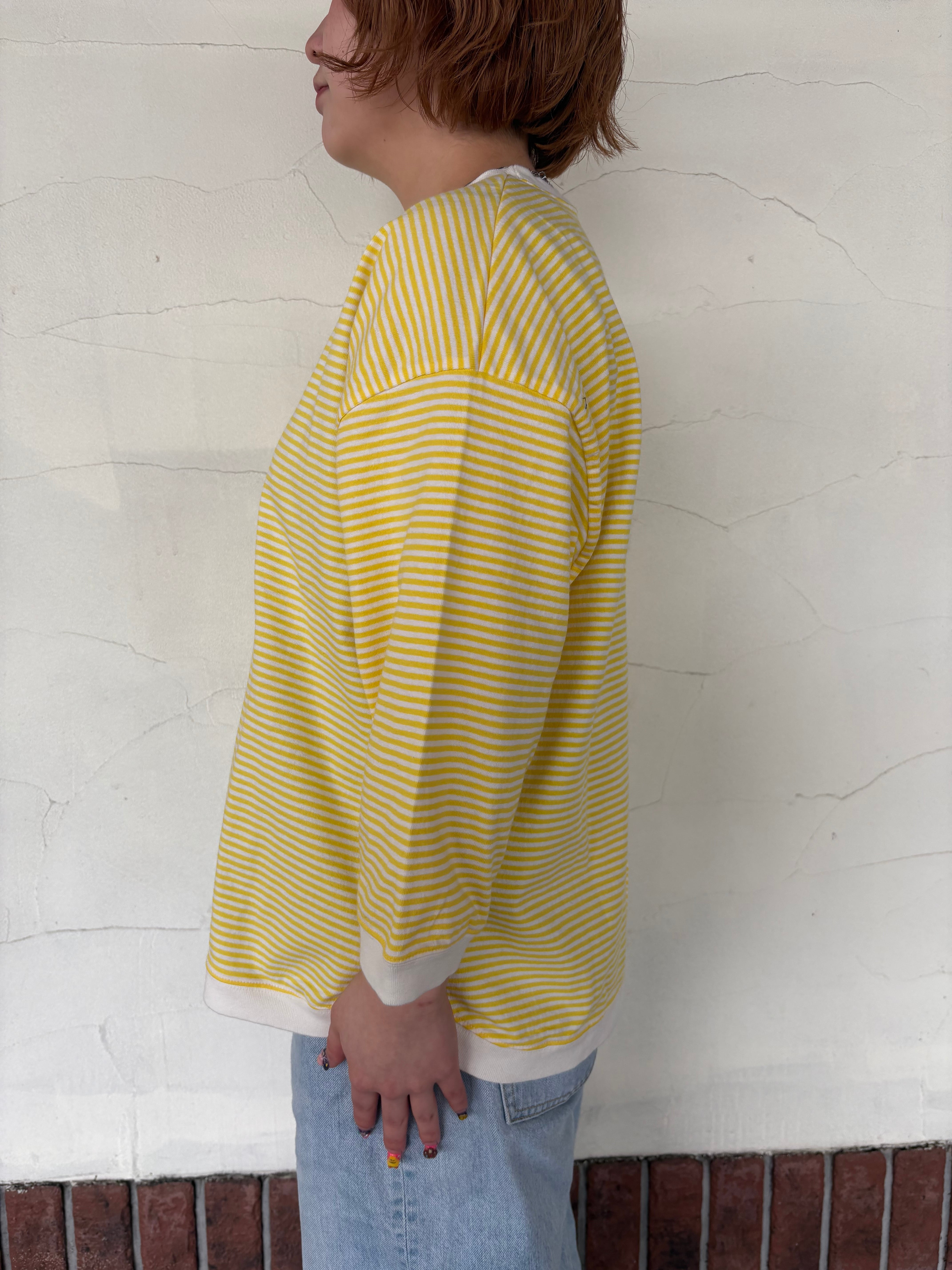 やさしいイエローの細ボーダーが、コーディネートを明るく見せてくれる七分袖Tシャツでございます。さらりとしたコットン100%の生地で、暑い時期にも心地よくお召しいただけます。