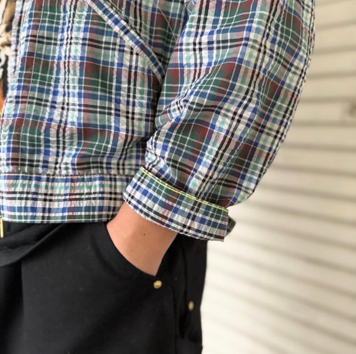 素材は、シアサッカーのマドラスチェック。凹凸のあるサッカー地は肌との接地面が少なく、通気性も良く、薄手で軽く、夏でも羽織れる快適さが魅力です。
