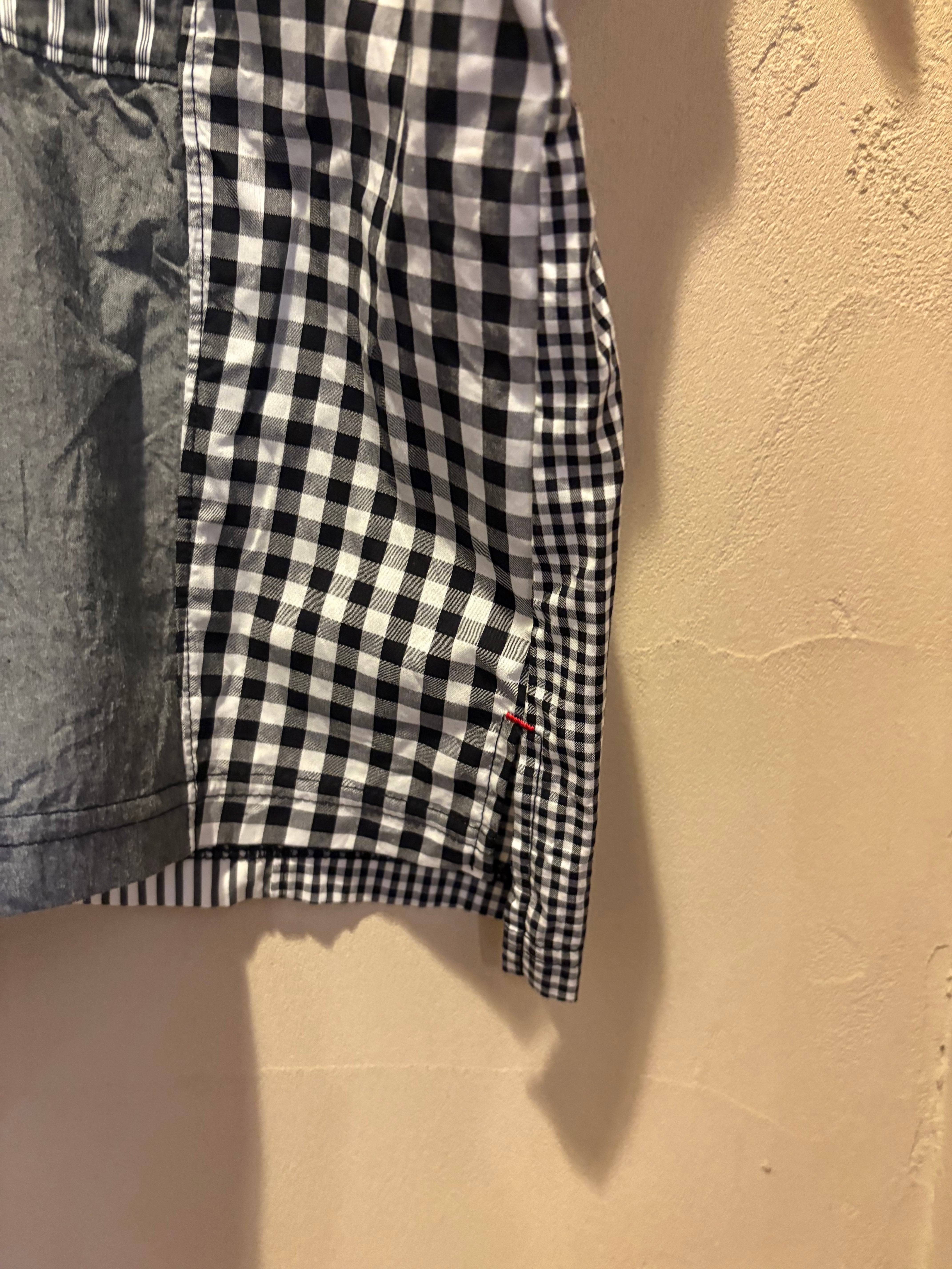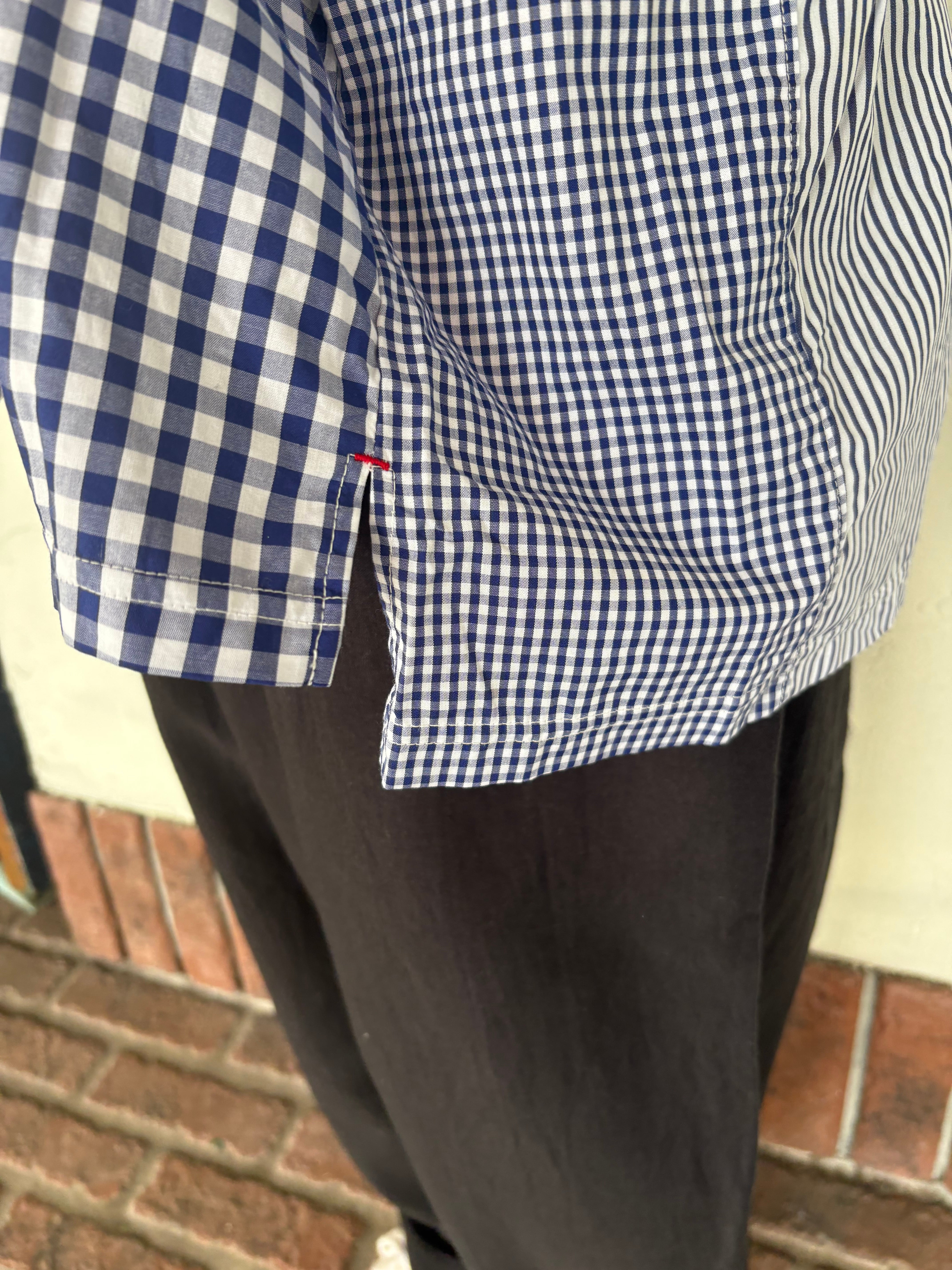 さらりとした肌離れの良さが快適な着心地で、ストライプやチェック、シャンブレーといった様々な種類の生地をパッチワークのように組み合わせたプルオーバー。