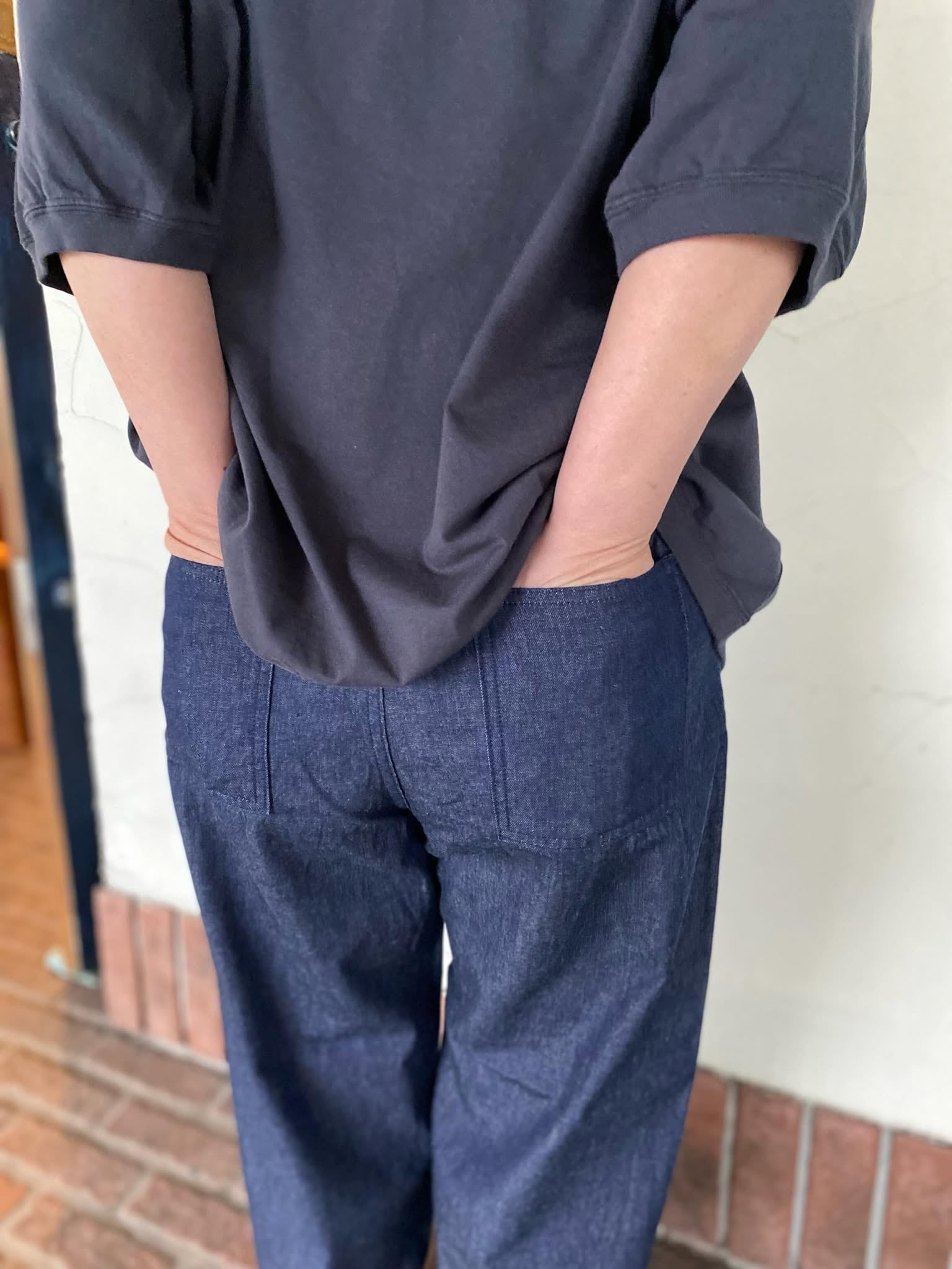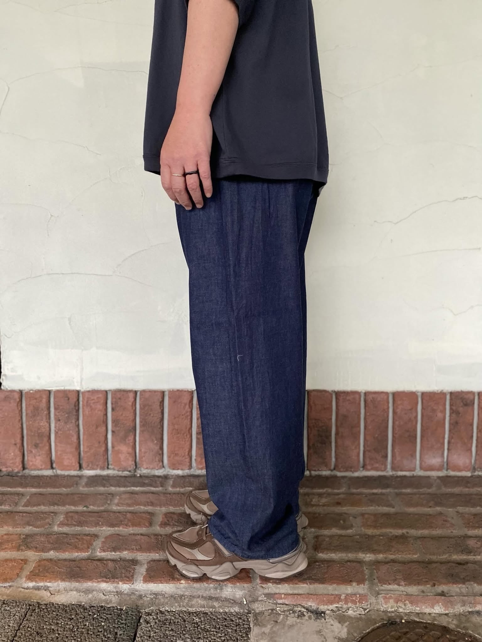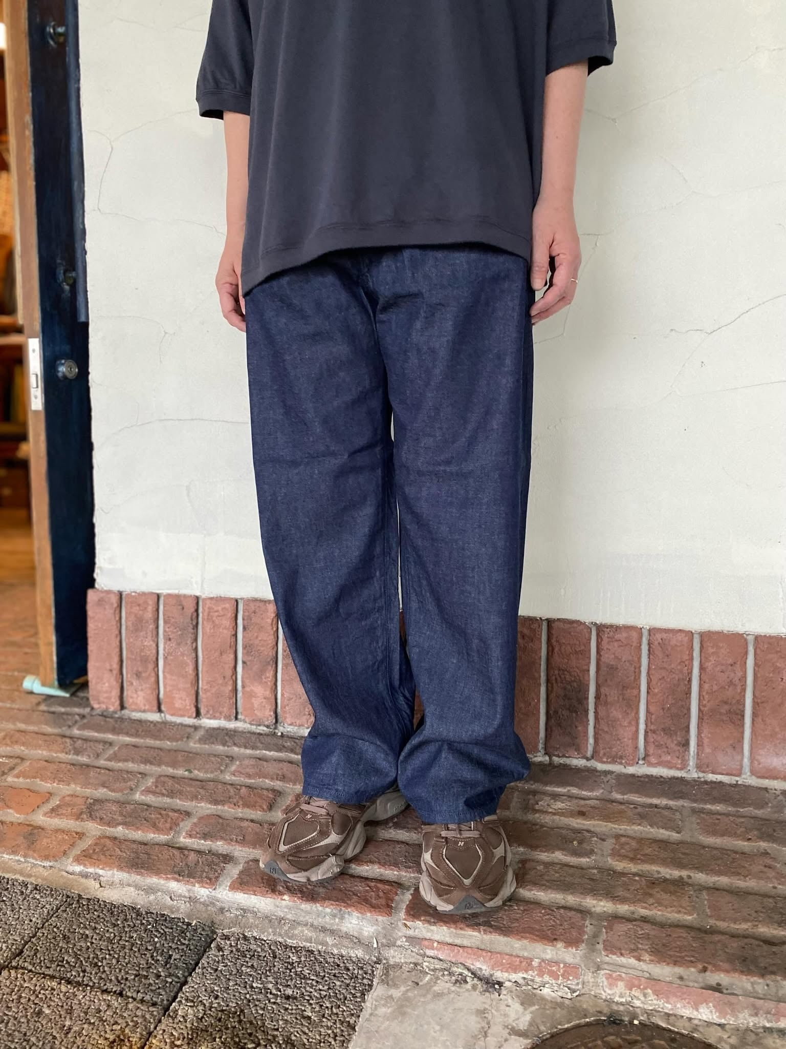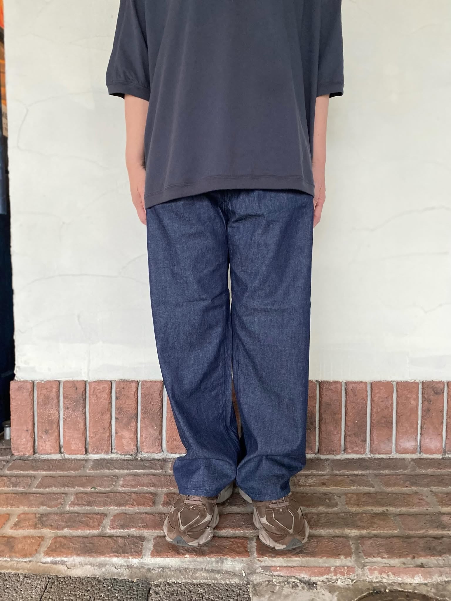 シンプルなストレートシルエット。ゆったりと涼しく穿けるようにウエストにはドローコードを入れ、イージーにギュッと絞って履く仕様になっています。ベースのデザインはシンプルですが、薄手で柔らかなのでスッと落ちるシルエットが綺麗でこだわり満載のパンツです。