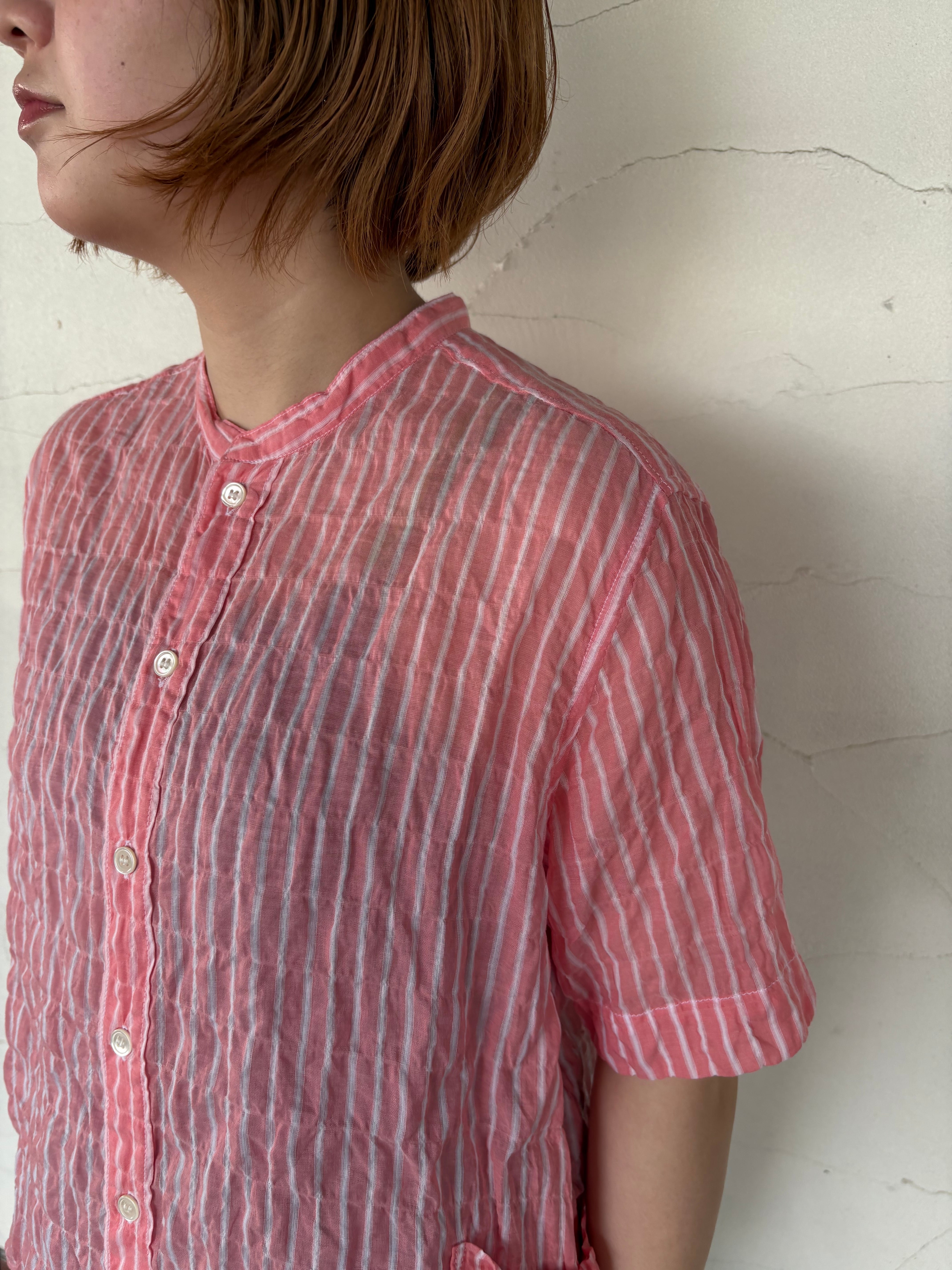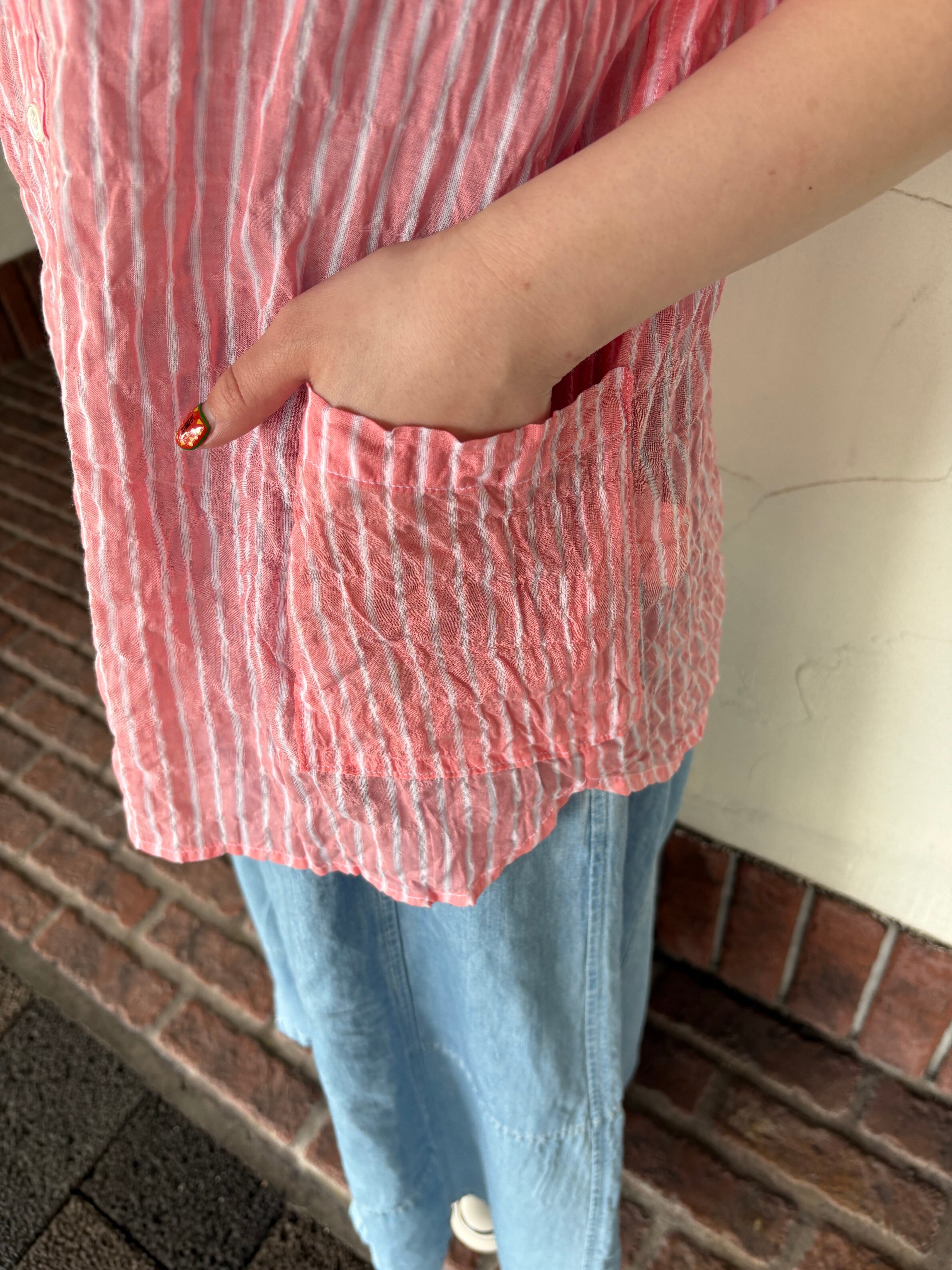 細かなシャーリングが生み出す自然な凹凸感が、シンプルながらも表情豊かで、さらっと着るだけで雰囲気が出るのが魅力です。肌にまとわりつかず、暑い季節でも快適に過ごせるのも嬉しいポイント。