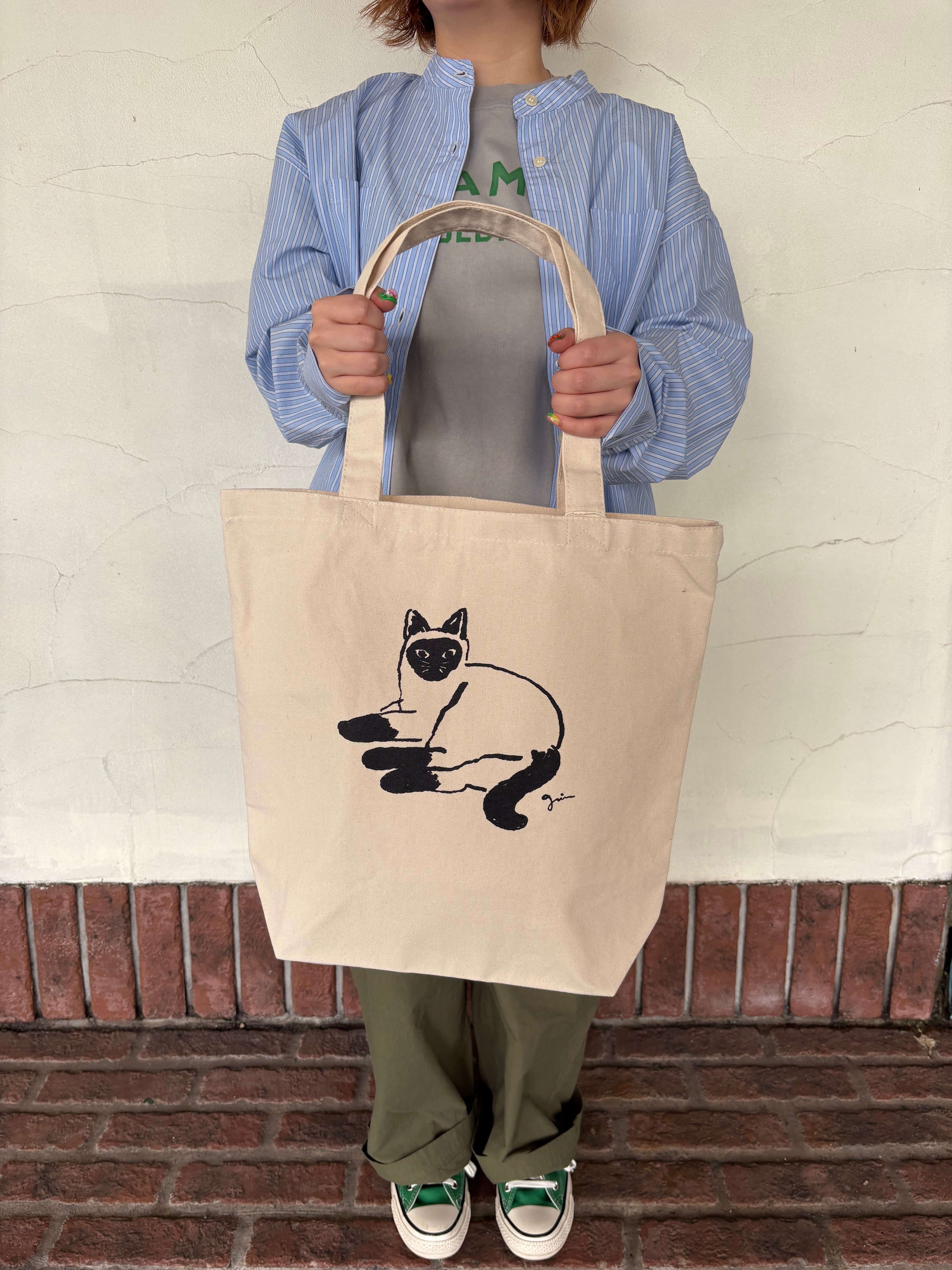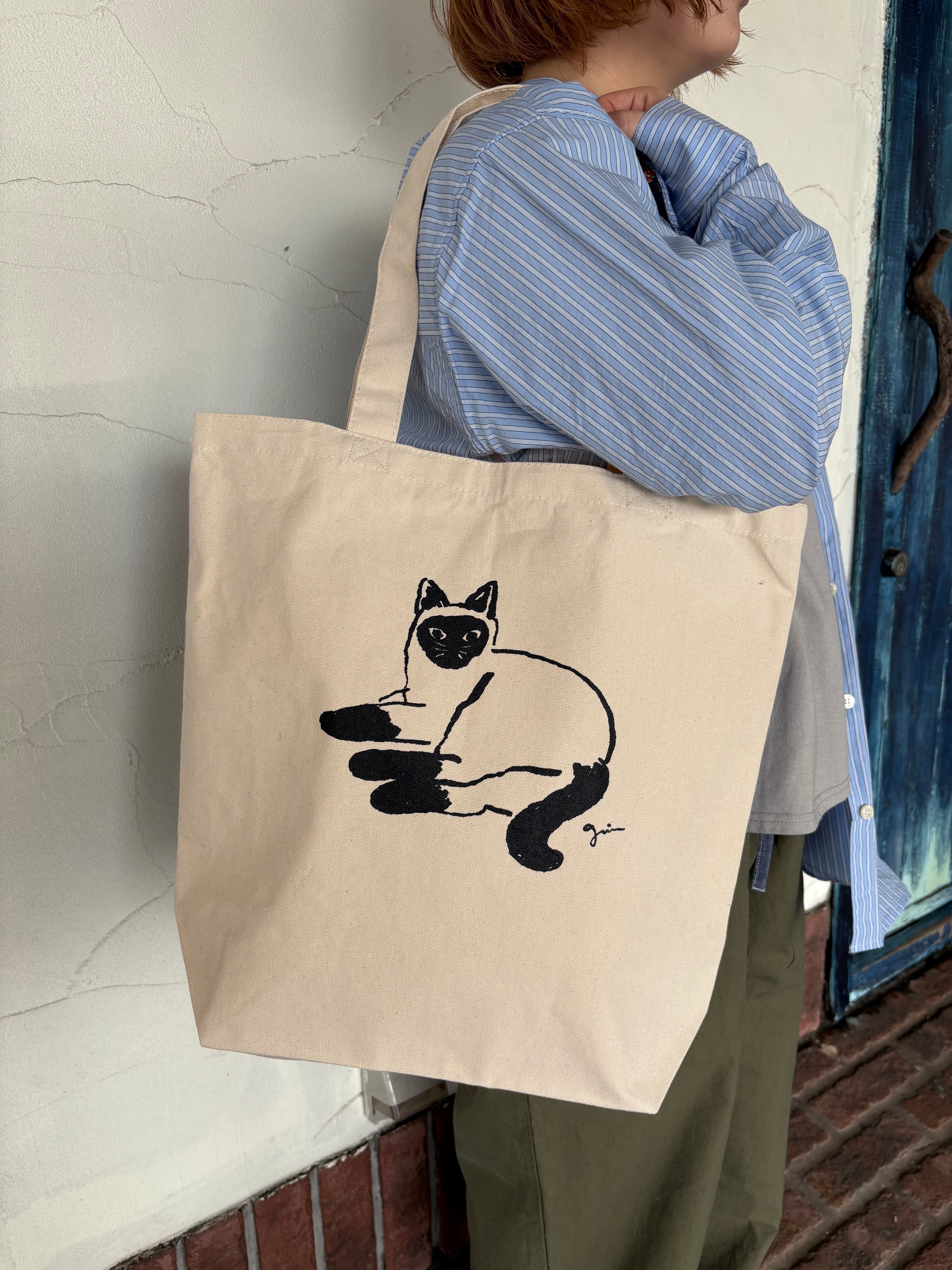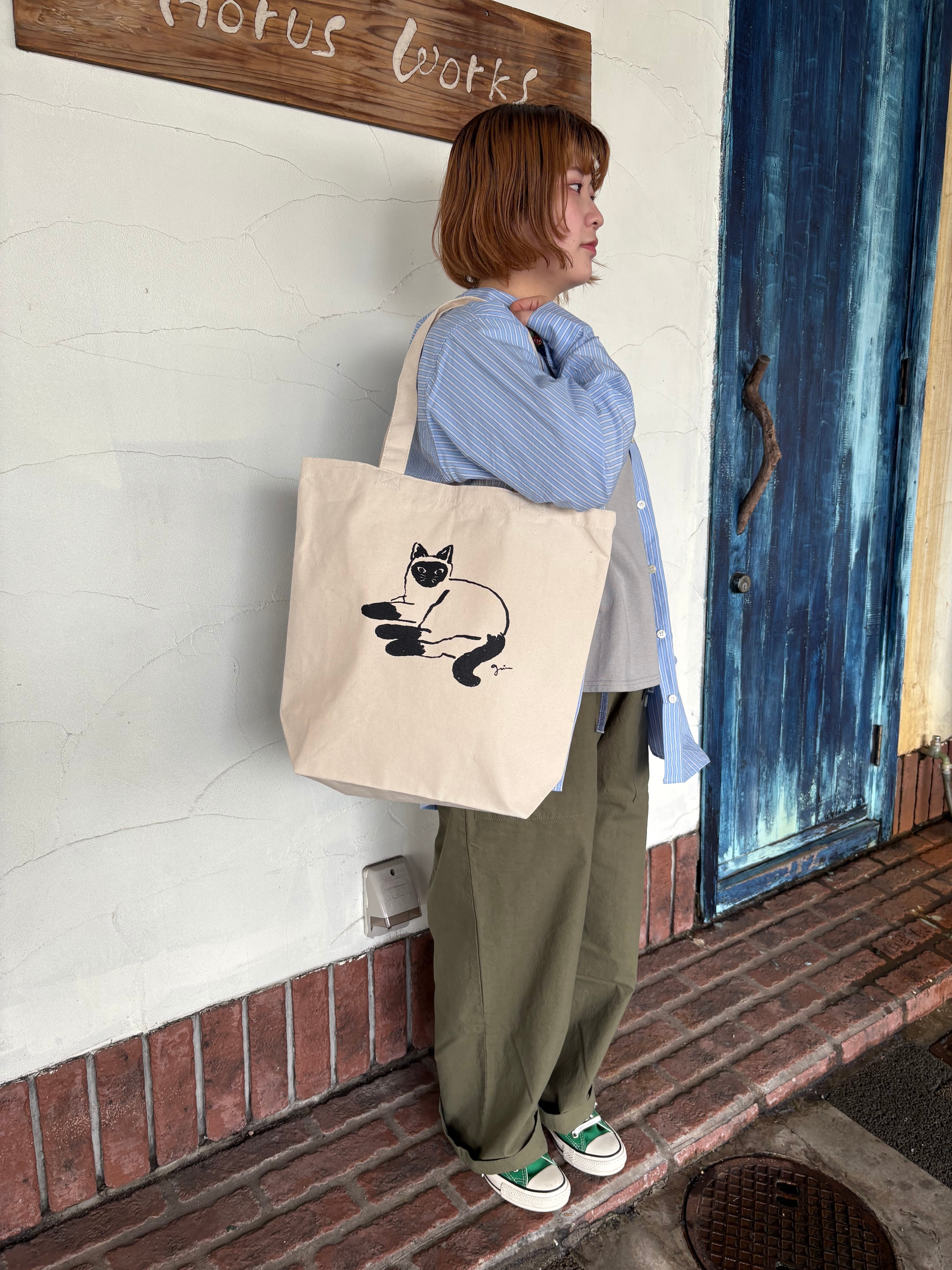 愛らしいシャムネコの表情が目を引く、grinのプリントバッグです。